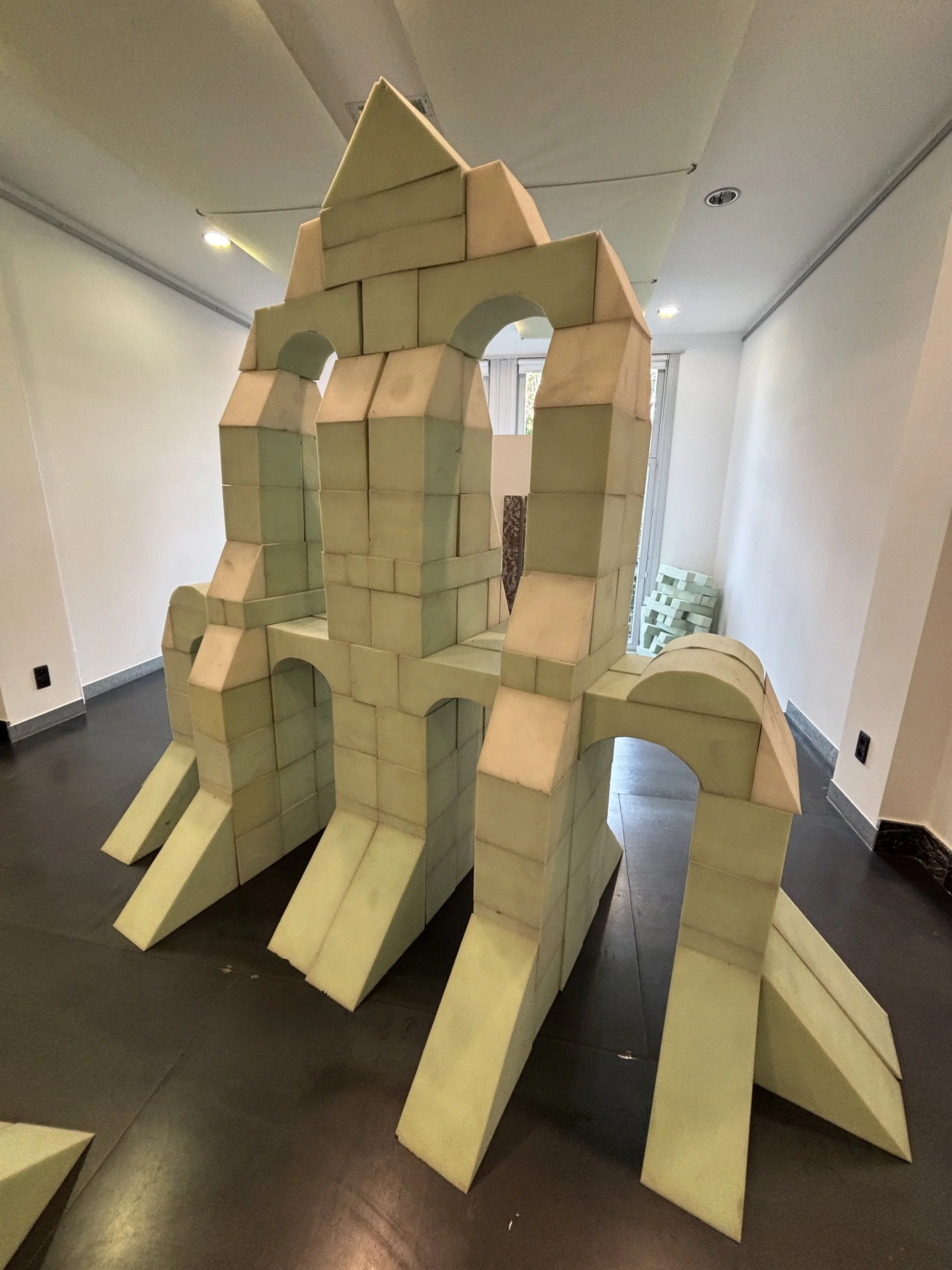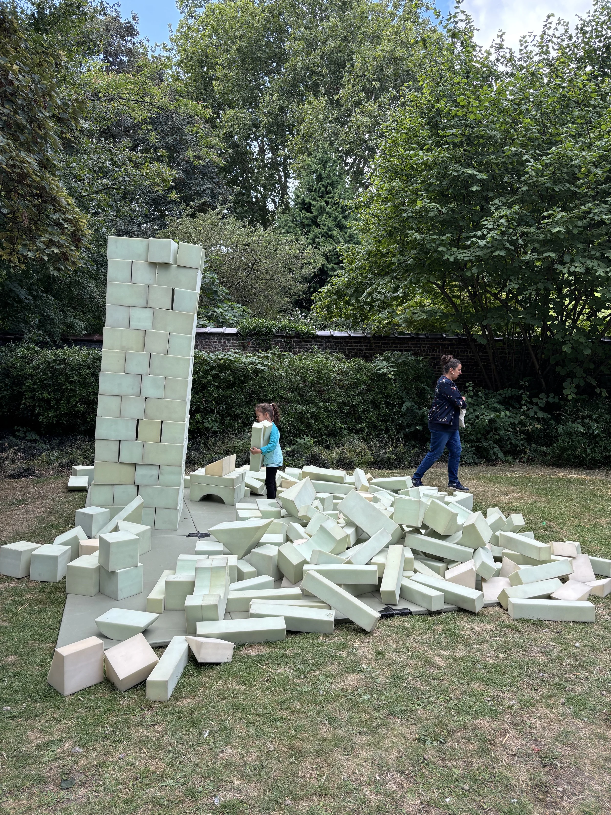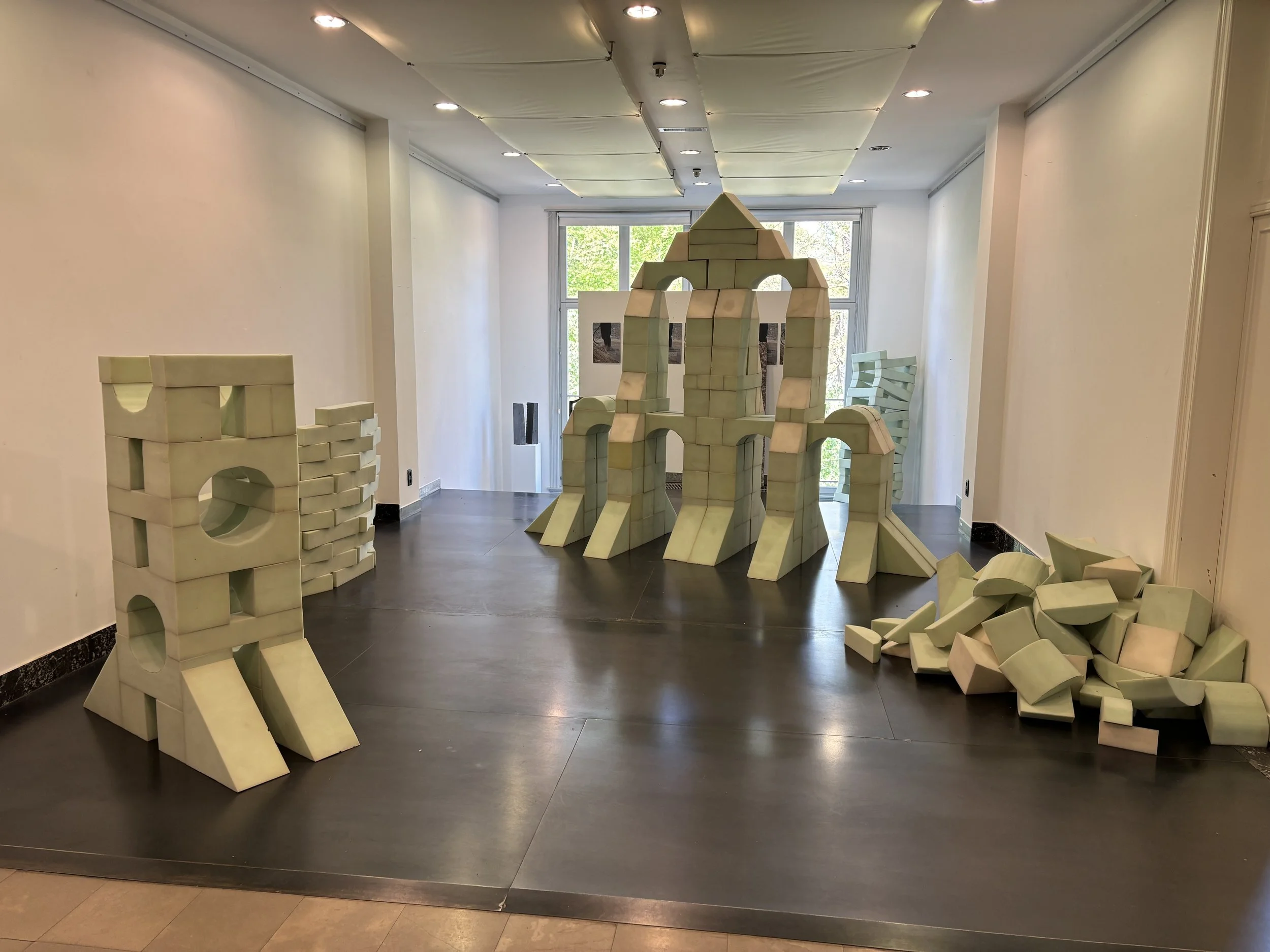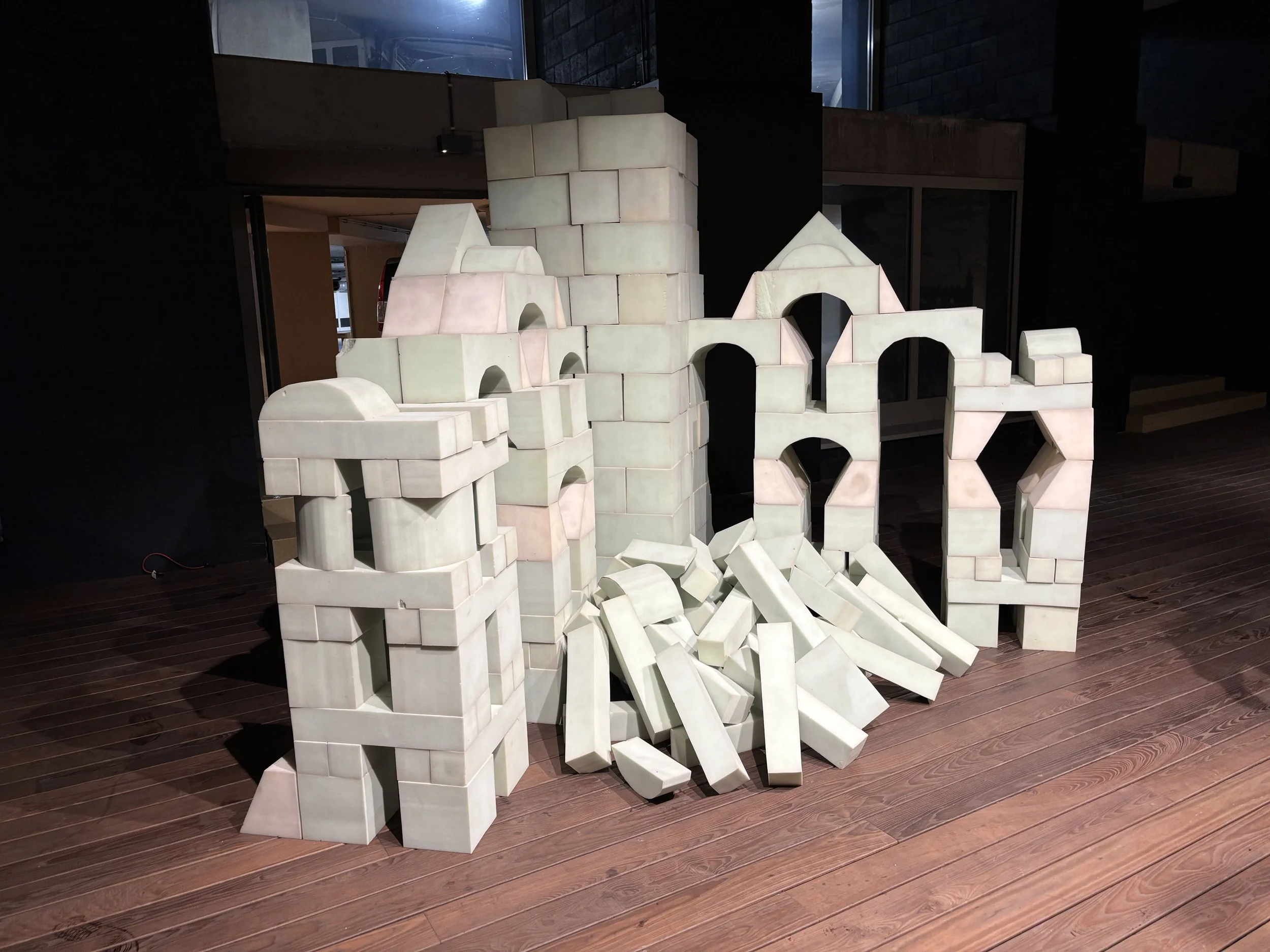 The foam blocks are abstractions of existing shapes within our towns, relating directly to the surrounding heritage. The installation is a physical method of directly relating to the site, which traditionally consists of immovable stones and protected bricks. By making light-weighted, harmless counterparts, the work functions as a carbon-copy of the original, which can then be moved, damaged and lived.